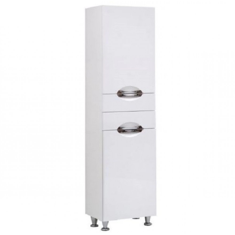 Пенал підлоговий 50 з сріблястими ручками, оснащений дверцятами і двома шухлядами, всередині зверху поличка і внизу полку. Корпус виконаний з ламінованого ДСП в білому кольорі, має додаткове лакове глянсове покриття. Фасади складаються з двох білих лицьових панелей і двох шухляд, які виконані з МДФ і пофарбовано вологостійкою високоякісної емаллю з високим ступенем блиску. Ручки в даному пеналі мають врізну форму. Можлива комплектація дзеркалом і тумбою.