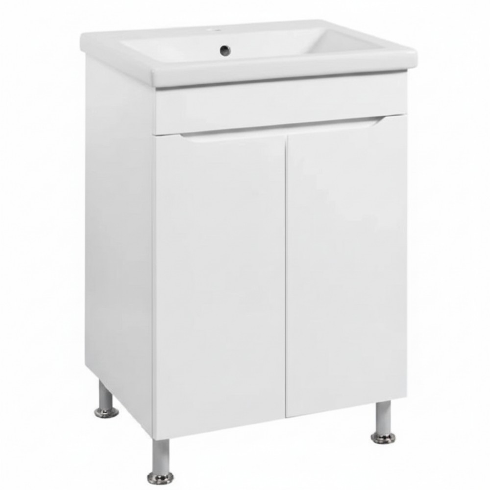 Тумба з умивальником Комо 60 на ніжках. Оснащена двома дверками. Корпус виконаний із ДСП у білому кольорі, має додаткове лакове глянсове покриття. Фасад складається з двох білих лицьових панелей, які виконані з ДСП і пофарбовані високоякісною вологостійкою емаллю з високим ступенем блиску. Можлива комплектація дзеркалом та пеналом.