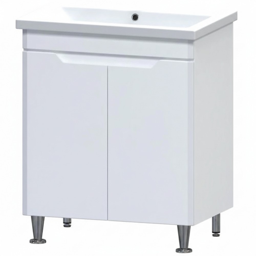 Тумба з умивальником Комо 70 на ніжках. Оснащена двома дверками. Корпус виконаний із ДСП у білому кольорі, має додаткове лакове глянсове покриття. Фасад складається з двох білих лицьових панелей, які виконані з ДСП і пофарбовані високоякісною вологостійкою емаллю з високим ступенем блиску. Можлива комплектація дзеркалом та пеналом.