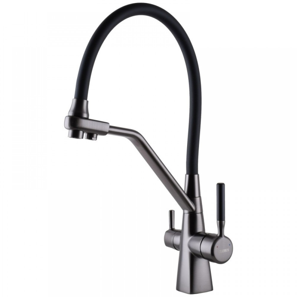 Кухонний змішувач Globus Lux LAZER GLLR-0700-L-11-01, комбінований під ОСМОС, чорний гофрогусак, колір корпусу графіт металік Комбінований змішувач вражає своєю продуманістю до використання і монтажу. Переваги комбінованих під систему зворотного осмосу моделей змішувачів Globus Lux: Вид монтажу: Врізний Вид змішувача: Одноважільний з перемиканням під осмос Тип виливу: Поворотний Підключення до фільтру і водопроводу- шланг + Quick fitting Діаметр підключення шлангів 1/2 ″ Кріплення- гайка Матеріал: Латунь Колір виробу: графіт/чорний Додаткові характеристики: - Монтаж на один отвір - Металевий важіль - Система швидкого монтажу - Гнучка проводка Країна реєстрації бренду: Україна