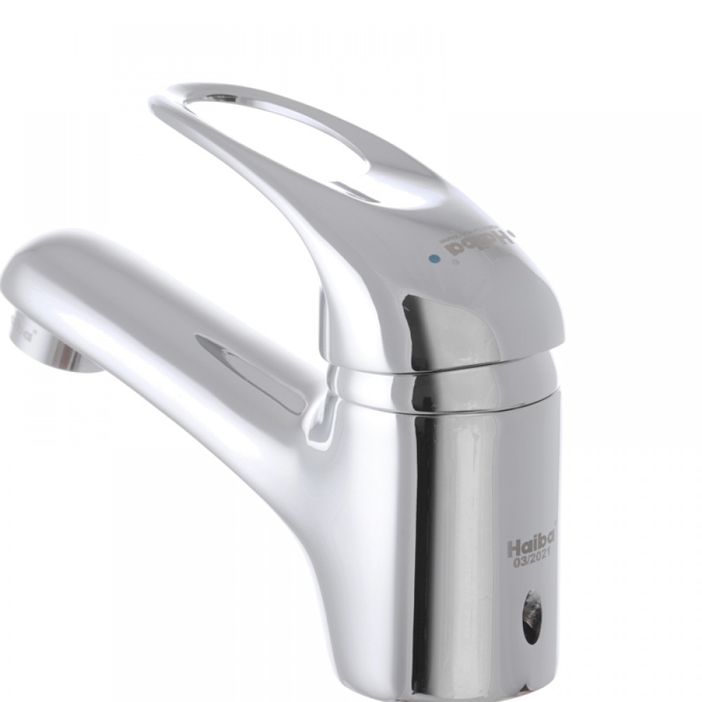 Одноручковий змішувач для умивальника HAIBA PREMIERE 001 (HB0344) відрізняється досить коротким розміром. Встановлюється на виріб. Кріпиться за допомогою різьбової шпильки та сталевої притискної шайби. У комплекті поставки також йдуть два гумові шланги для підведення гарячої та холодної води. Змішувач виготовлений з латуні класу А (мідно-цинковий сплав). Поверхня вкрита дзеркальним хромом . У крані встановлено аератор Neoperl. Для керування водою служить італійський картридж, який можна міняти після виходу з ладу. Кран упакований у гарну фірмову коробку Haiba.