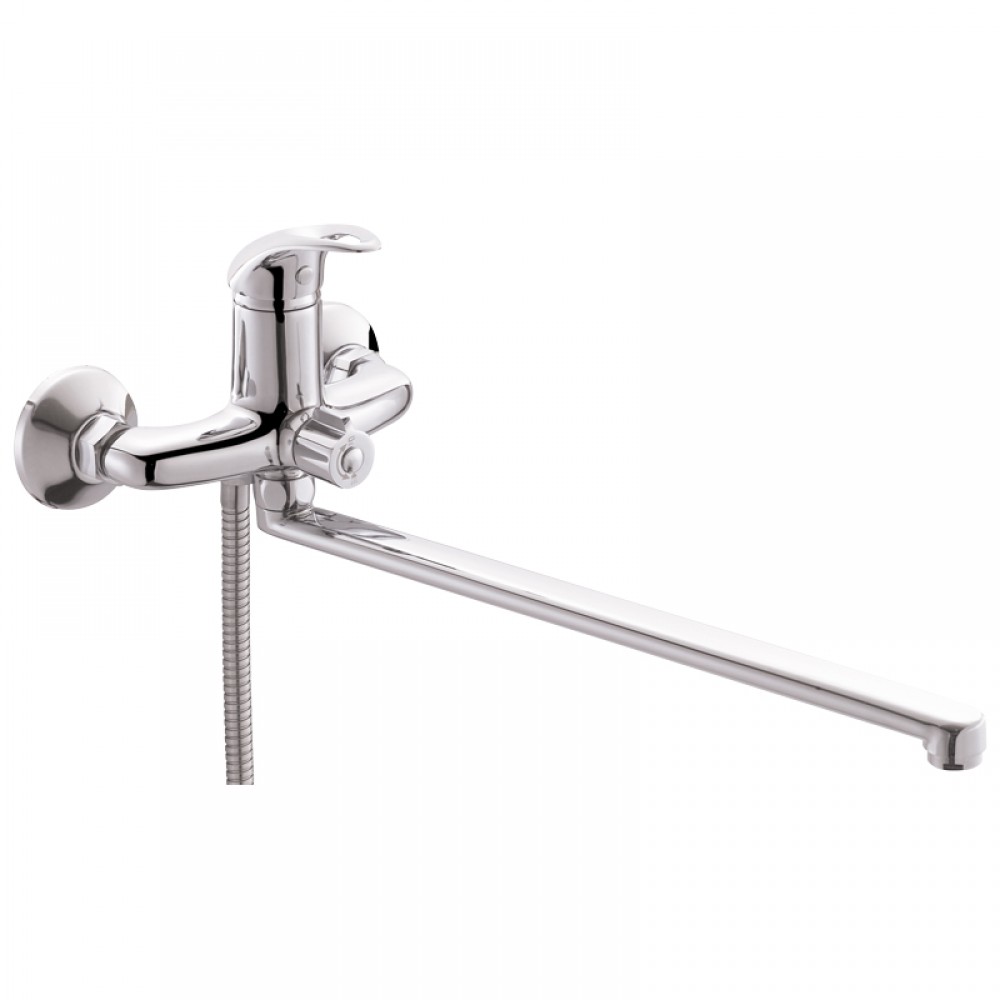 Одноручковий змішувач для ванни Haiba PREMIERE 006 (HB0350) відрізняється довгим 322 мм виливом поворотного типу із вбудованим аератором Neoperl для зниження витрати води. Як запірний елемент в ньому використовується висококласний 35 мм картридж від іспанського виробника Sedal, а для зручності експлуатації в нього вбудований перемикач євро . Закріплюється змішувач за допомогою ексцентриків на вмонтованих у стіну трубах. Виготовлений з латуні, хромований та відполірований до дзеркального блиску. Має сталевий відтінок. Комплектація включає ексцентрики, декоративні чашки для них, гумові прокладки, а також 5 режимну лійку, шланг довжиною 1,5 метра, металевий тримач для лійки та аератор.